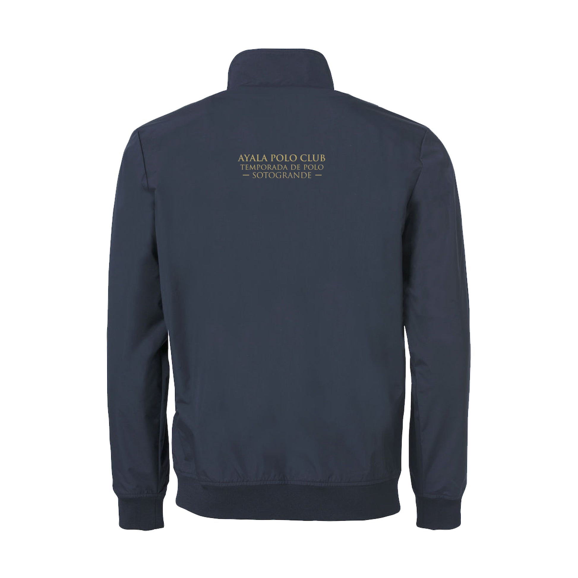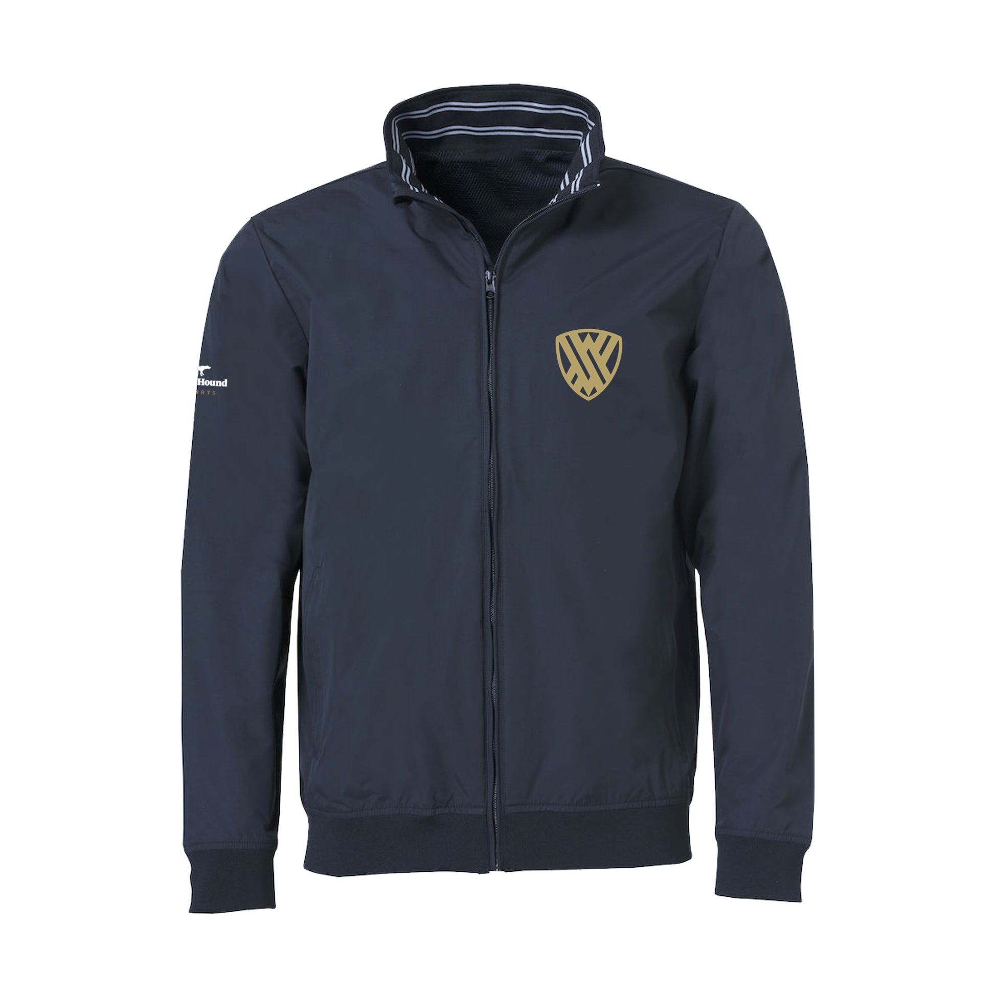 This modern unisex take on a Harrington style jacket with 2 front pockets and White contrast stripes in neck. Ayala logo embroidered on front left and back, Black Hound Sports logo on right arm.