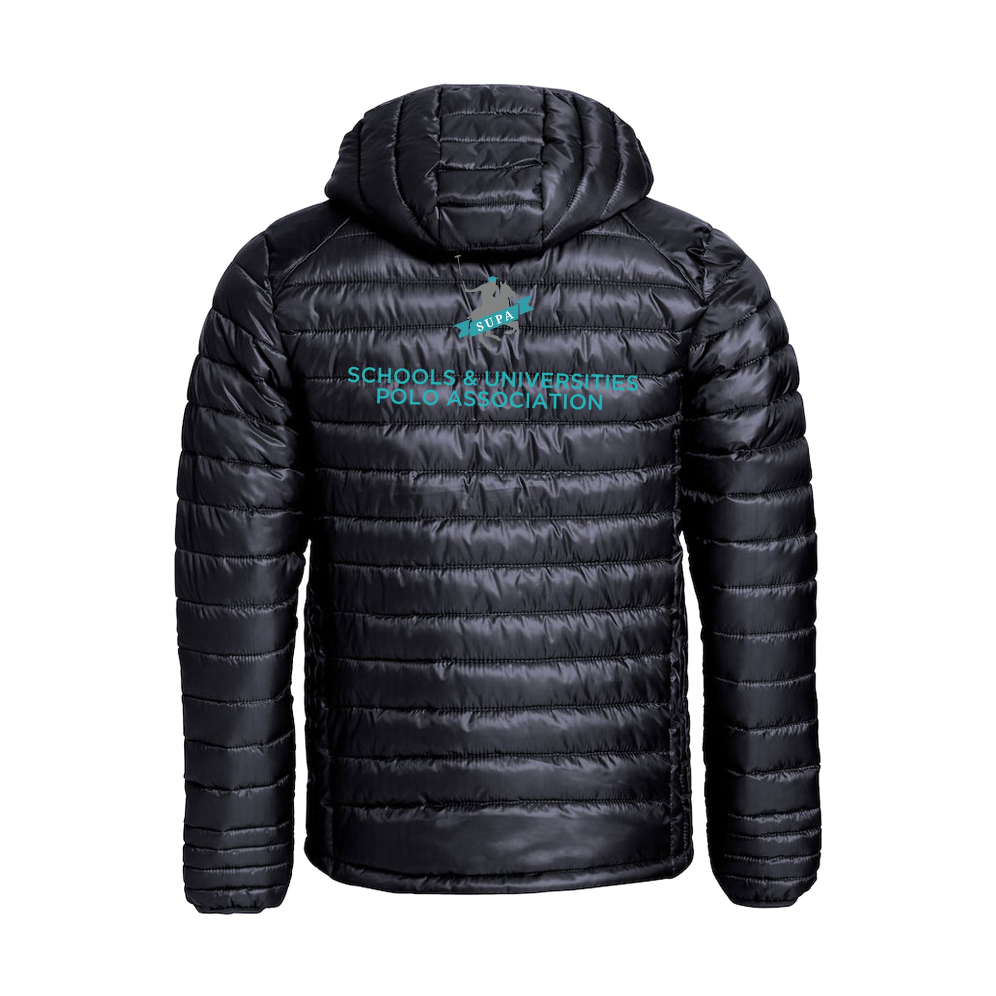 Detachable hood padded jacket with SUPA logo on front left chest and back. Black Hound Sports logo on right arm.